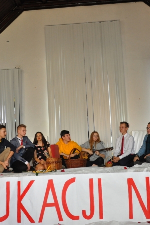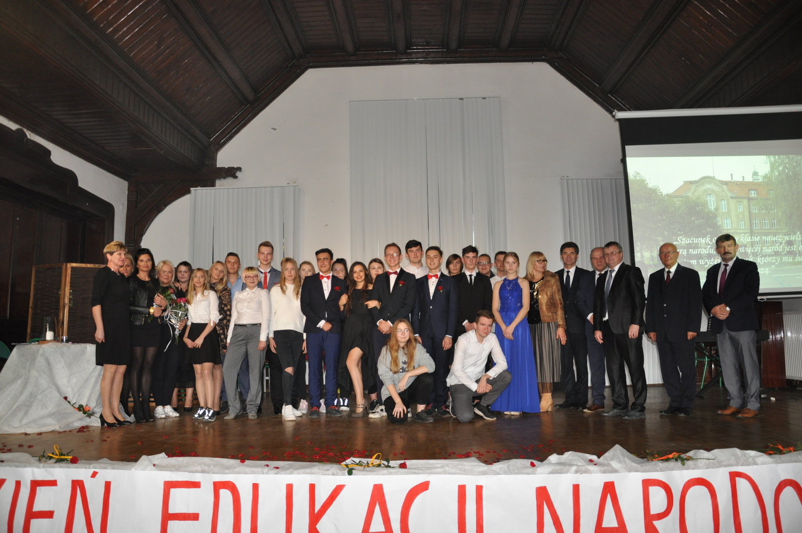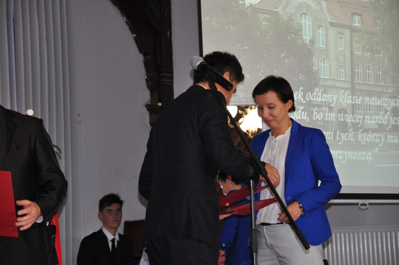Kolejną częścią uroczystości było wręczenie nagród Starosty wyróżniającym się w pracy dyrektorom i nauczycielom. Na program artystyczny, przygotowany przez młodzież pod kierunkiem nauczycieli: P. Agnieszki Chłopaś, P. Julity Kasprowicz i P. Anny Magnowskiej, złożyła się inscenizacja spotkania po latach absolwentów szkoły na Wrocławskiej, wspominających z rozrzewnieniem lata szkolne i dziękujących pedagogom za ich życiową mądrość, cierpliwe i wytrwałe przekazywanie wiedzy oraz okazane serce. Nauczyciele zostali przedstawieni jako ludzie z pasją, inspirujący wychowanków do stania się tymi, kim mogą i pragną być. Wspominani opiekunowie włożyli wiele wysiłku, by rozniecić w wychowankach aspiracje i nauczyć ich korzystać z mądrości patrona szkoły i ludzi, którzy ją tworzyli. Walorem inscenizacji była różnorodność środków wyrazu, wyrazista gra szkolnych artystów, ciekawy pokaz multimedialny, wykonane na żywo piosenki i utwory instrumentalne, a szczególnie zamykający przedstawienie występ włoskich tenorów z zespołu „Il volo”.