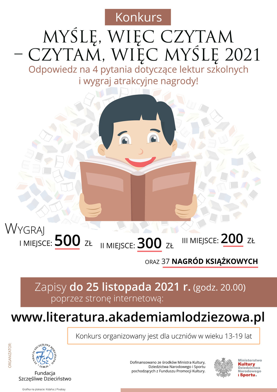 Serdecznie zachęcamy Państwa uczniów do udziału w ogólnopolskim konkursie dotyczącym znajomości lektur szkolnych „Myślę więc czytam - czytam więc myślę 2021” organizowanym przez młodzież z Akademii Młodzieżowej, działającej w ramach Fundacji Szczęśliwe Dzieciństwo. Konkurs adresowany jest do wszystkich uczniów w wieku 13-19 lat. Celem konkursu jest promowanie czytelnictwa oraz popularyzowanie wśród młodzieży szkolnej wiedzy o lekturach. Zależy nam również na promowaniu nietypowych i aktywnych form poznawania literatury.