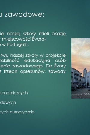Było to możliwe dzięki uczestnictwu naszej szkoły w projekcie Erasmus+, krótkoterminowa mobilność edukacyjna osób uczących się w ramach kształcenia zawodowego. Do Évory wyjechało kilka zawodów oraz trzech opiekunów, zawody które reprezentowały szkołę to:
