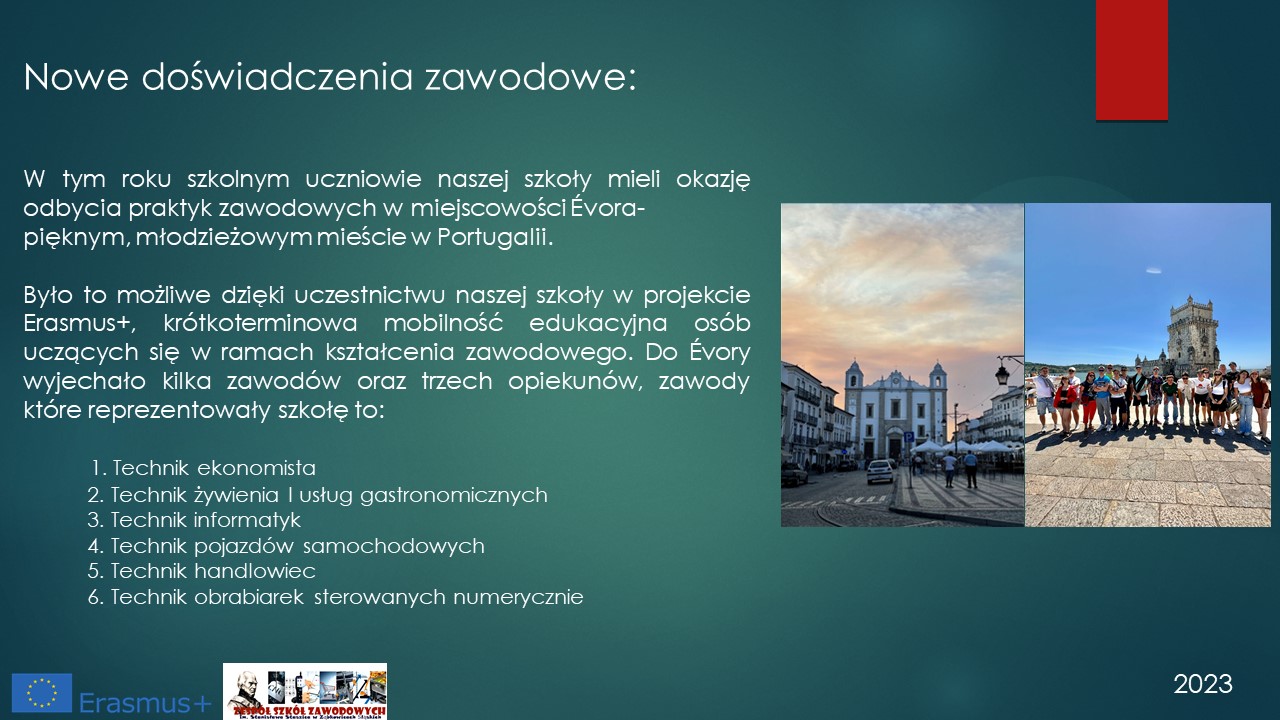 W tym roku szkolnym uczniowie naszej szkoły mieli okazję odbycia praktyk zawodowych w miejscowości Évora-