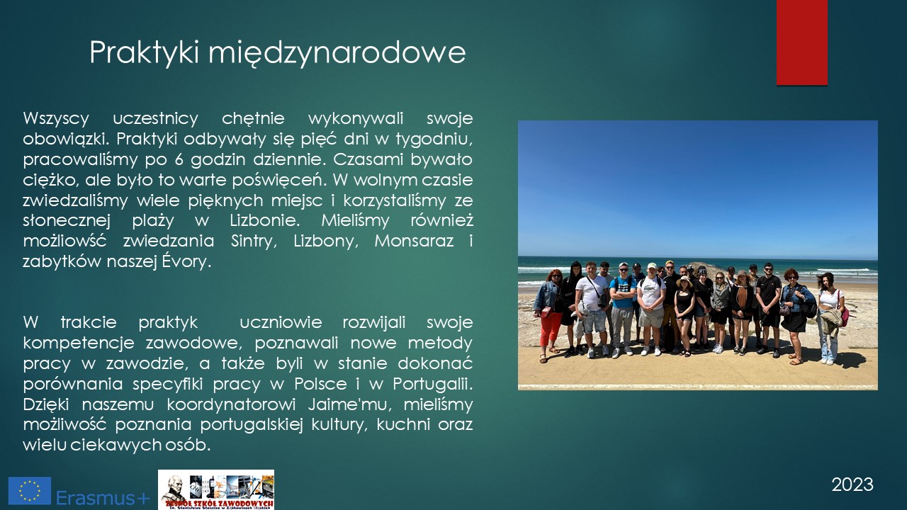 W trakcie praktyk uczniowie rozwijali swoje kompetencje zawodowe, poznawali nowe metody pracy w zawodzie, a także byli w stanie dokonać porównania specyfiki pracy w Polsce i w Portugalii. Dzięki naszemu koordynatorowi Jaime'mu, mieliśmy możliwość poznania portugalskiej kultury, kuchni oraz wielu ciekawych osób.