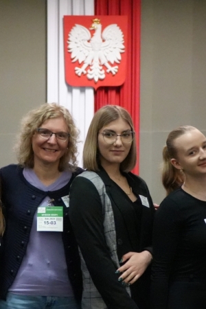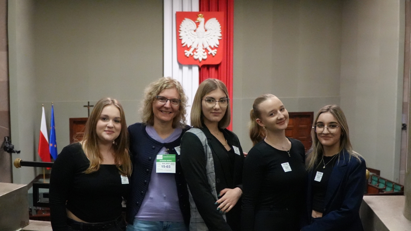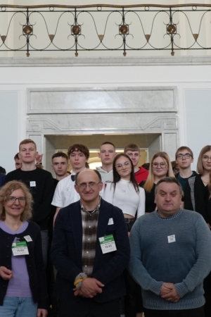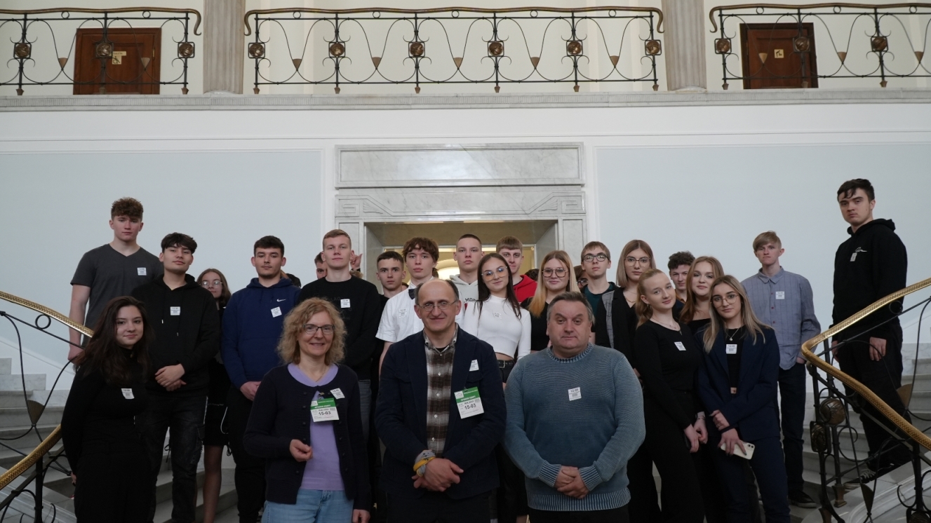 Historię tego wyjątkowego dla wszystkich Polaków miejsca przybliżył nam przewodnik, zaczynając od przedstawienia makiety całego kompleksu. Kiedy zasiedliśmy na krzesłach w Sali Posiedzeń Sejmu, ze wzruszeniem i uwagą przyglądaliśmy się szczegółom znanym nam dotychczas tylko z przekazów medialnych i z uwagą wysłuchaliśmy ciekawej prelekcji naszego przewodnika. W ten sposób utrwaliliśmy swoją wiedzę na temat historii polskiego parlamentaryzmu, znaczenia poszczególnych miejsc w Sali Posiedzeń, zasad wybierania posłów i senatorów, procedury głosowania i uchwalania ustaw sejmowych. Następnie przeszliśmy do hallu, w którym posłowie udzielają wywiadów; widzieliśmy też stanowisko reporterów i dziennikarzy. Przewodnik pokazał nam niektóre z tablic pamiątkowych utrwalających ważne wydarzenia, m.in. mogliśmy przeczytać słowa Jana Pawła II wypowiedziane podczas wizyty w polskim parlamencie czy obejrzeć zachowane laski marszałkowskie z różnych okresów historycznych. W reprezentacyjnym hallu zrobiliśmy sobie pamiątkowe zdjęcia, pożegnaliśmy naszego przewodnika i udaliśmy się do stołówki sejmowej na obiad, który bardzo wszystkim smakował.