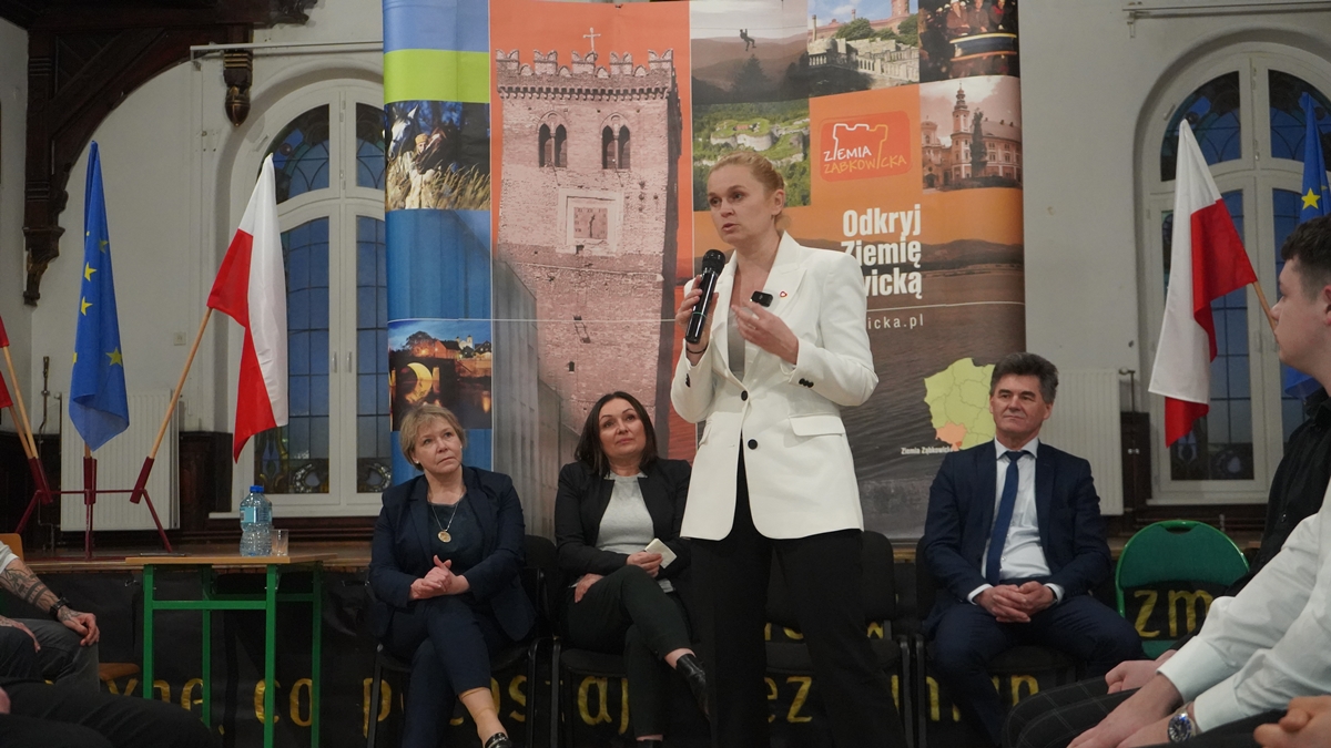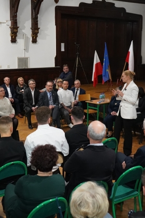 Pani Minister i goście przed spotkaniem/debatą nt. oświaty wizytowali warsztaty w Zespole Szkół Zawodowych im. Stanisława Staszica w Ząbkowicach Śląskich i byli pod wrażeniem działań i projektów w szkole, jakie realizuje Powiat Ząbkowicki. Następnie w auli Zespołu Szkół Zawodowych przy ul. Wrocławskiej odbyła się ponad godzinna debata, podczas której uczniowie ze szkół powiatu oraz nauczyciele zadawali pytania, zgłaszali problemy wynikające z obecnie funkcjonującego systemu oświaty. Pani Minister odpowiadała na pytania; odpowiedzi udzielała również Pani Marszałek - Monika Wielichowska.