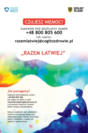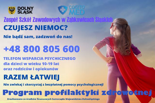 Pragniemy poinformować, że w trosce o zdrowie oraz dobre samopoczucie naszych uczniów, Zespół Szkół Zawodowych w Ząbkowicach Śląskich bierze udział w programie o nazwie: "Program profilaktyki zdrowotnej w zakresie profilaktyki zaburzeń psychicznych, w tym depresji oraz zapobiegania samobójstwom dla dzieci i młodzieży na terenie Województwa Dolnośląskiego - RAZEM ŁATWIEJ".