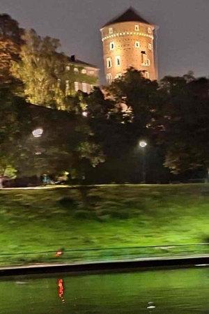 Po dotarciu do „Grodu Kraka” i zameldowaniu się w pensjonacie, grupa poszła na Rynek aby przywitać się z Adamem Mickiewiczem oraz podziwiać m.in. sukiennice. Po obiadokolacji, pomimo nadal przelotnie padającego deszczu, Bulwarami Wiślanymi uczniowie dotarli do przystani, skąd wypłynęli na wieczorny, godzinny rejs po Wiśle. W drodze powrotnej po rejsie, młodzież przywitała się ze Smokiem Wawelskim, który na ich widok buchnął ogniem.