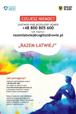 Przypominamy, że w trosce o zdrowie oraz dobre samopoczucie naszych uczniów, Zespół Szkół Zawodowych w Ząbkowicach Śląskich w dalszym ciągu bierze udział w programie o nazwie: "Program profilaktyki zdrowotnej w zakresie profilaktyki zaburzeń psychicznych, w tym depresji oraz zapobiegania samobójstwom dla dzieci i młodzieży na terenie Województwa Dolnośląskiego - RAZEM ŁATWIEJ".