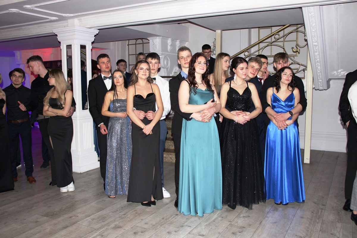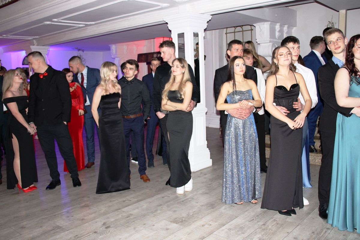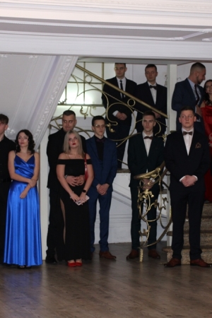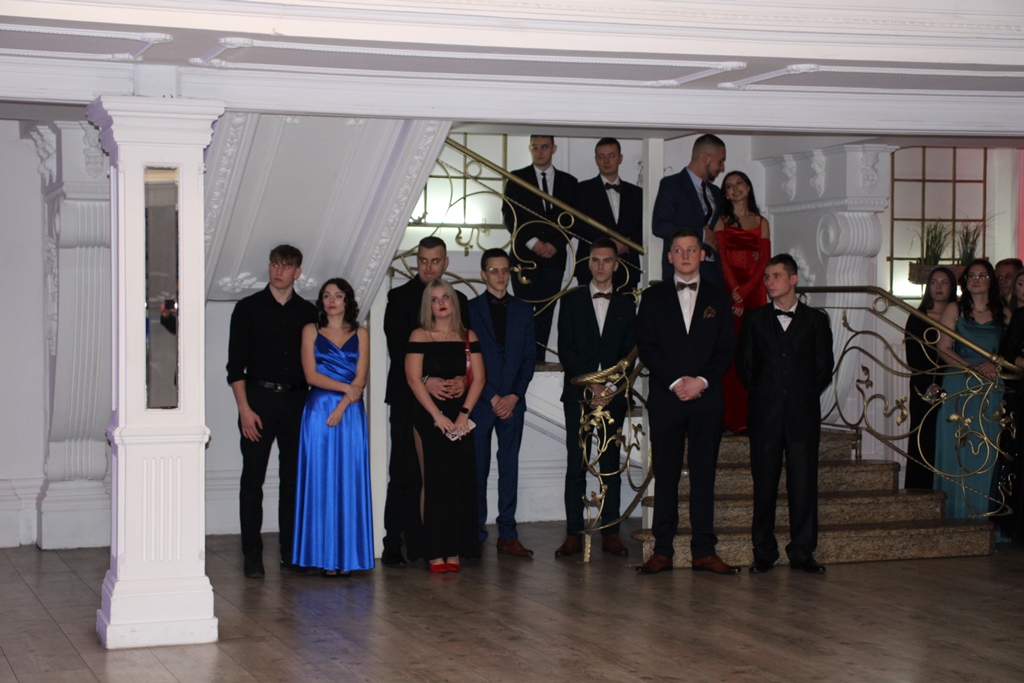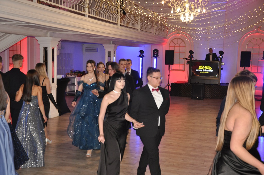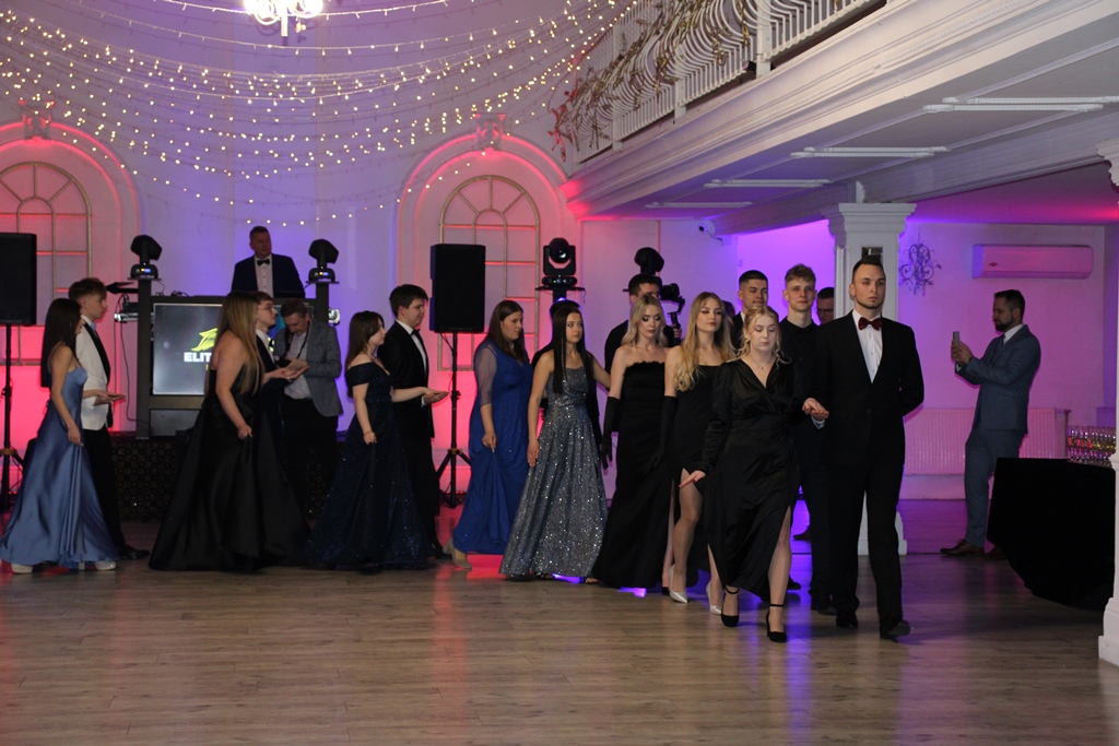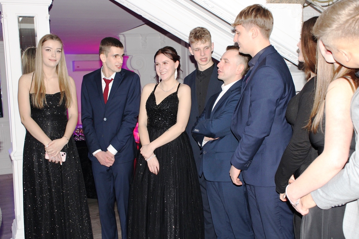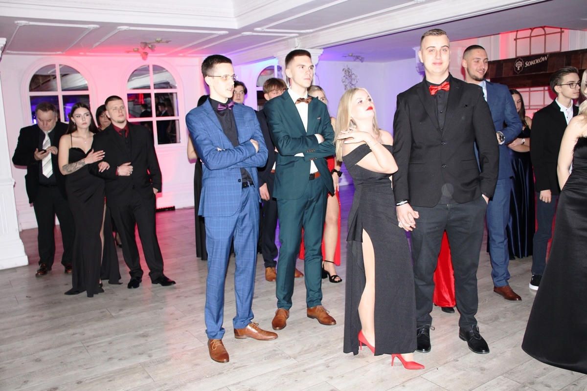 i Annę Pintal – kl. 5EE, którym podziękował za trud wychowawczy. W imieniu rodziców organizujących bal studniówkowy głos zabrała Pani Beata Kurek. Szczególnie miłym akcentem było wręczenie przez maturzystów kwiatów i przekazanie słów wdzięczności Panu Staroście, Panu Burmistrzowi, Dyrektorom Szkoły, nauczycielom, wychowawcom oraz rodzicom. Bal studniówkowy otworzył Pan Dyrektor, zapowiadając Poloneza, który przepięknie wykonali maturzyści pod czujnym okiem Pani Anny Wilk. Część oficjalna została uświetniona także przez wniesienie na salę pięknego tortu ze świecącymi fontannami. Uczniowie technikum zabrali także wszystkich w podróż sentymentalną w przeszłość ostatnich pięciu lat za pośrednictwem przygotowanej prezentacji. Zdjęcia i rodzące się przy tym wspomnienia pokazały, jak był to ważny okres w procesie wychowawczym i edukacyjnym młodzieży. Po części oficjalnej i smacznym obiedzie rozpoczęła się wspólna zabawa. Taneczna muzyka, smaczne potrawy i przekąski a przede wszystkim wspólna zabawa, rozmowy i czas mile spędzony w przyjemnym towarzystwie, pięknej sali na pewno będą długo wspominane przez maturzystów i zaproszonych gości. Szczególne podziękowania należą się organizatorom uroczystości – Rodzicom, którzy zadbali nie tylko o piękną salę, smaczne menu, ale przede wszystkim o sympatyczną atmosferę. Młodzieży należy podziękować za pierwszy zdany egzamin z kulturalnego i dojrzałego zachowania się na zabawie studniówkowej.