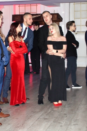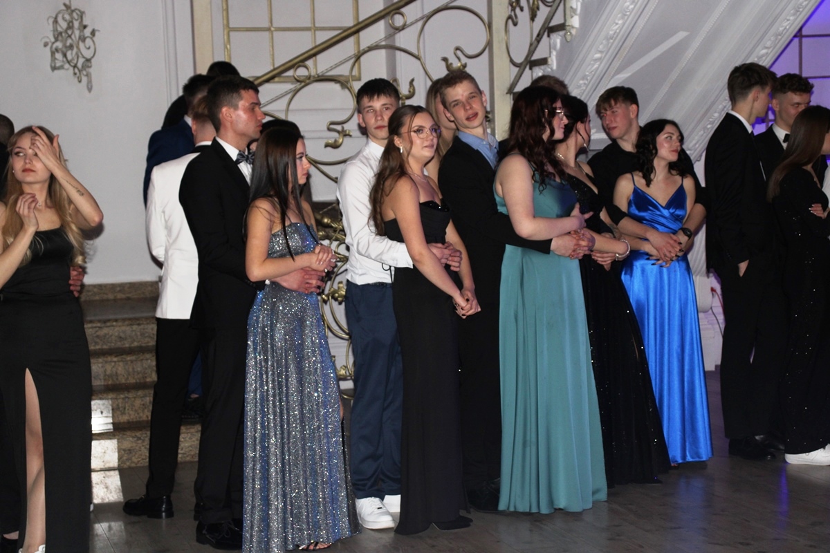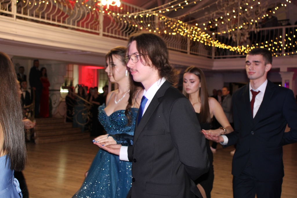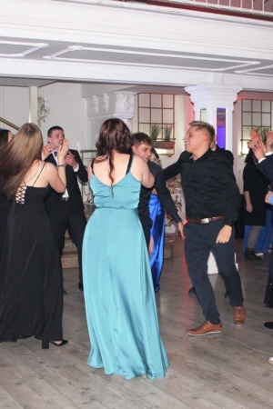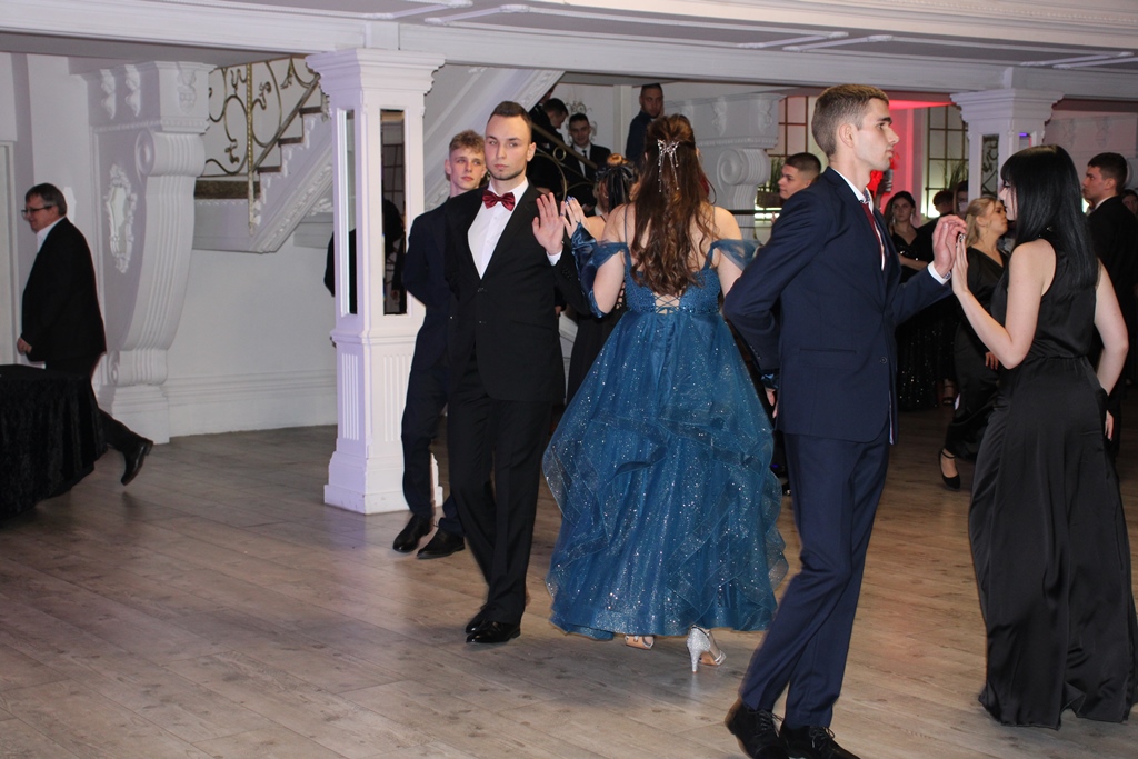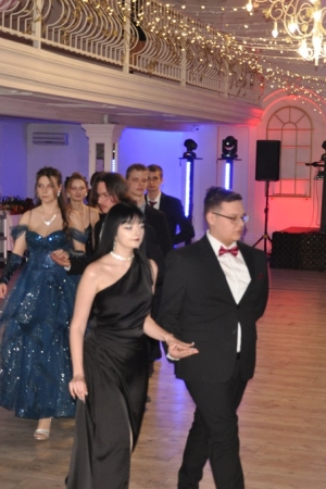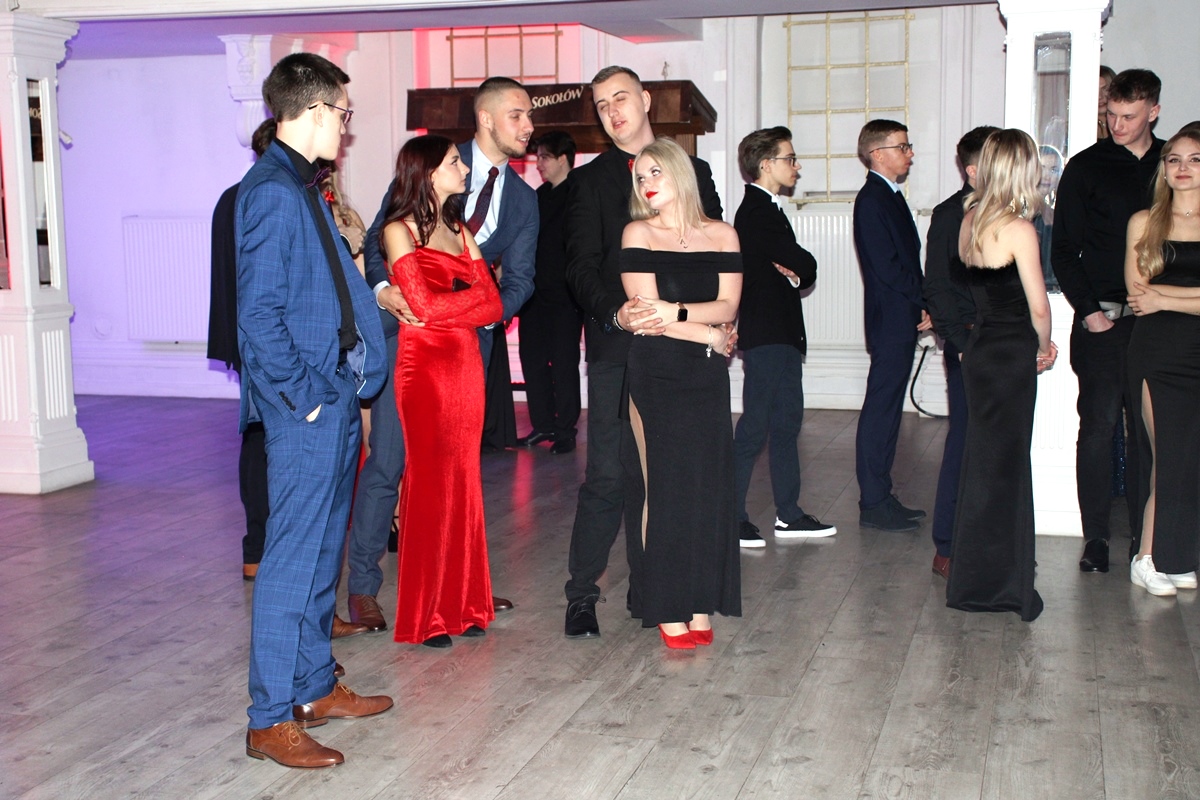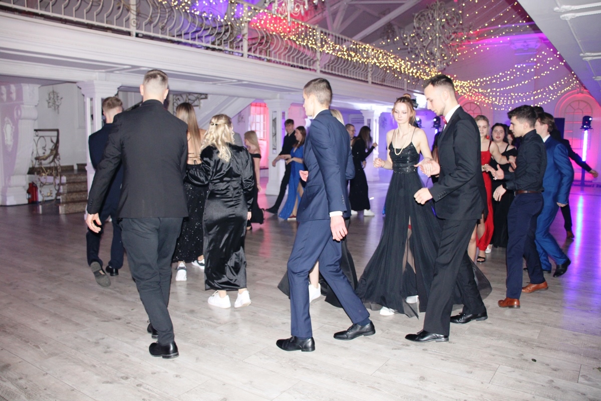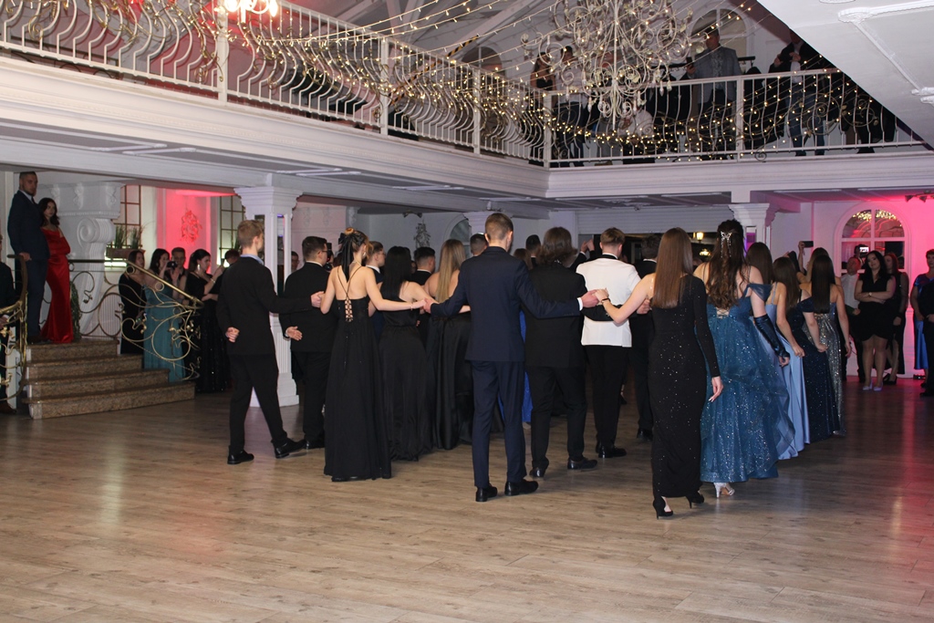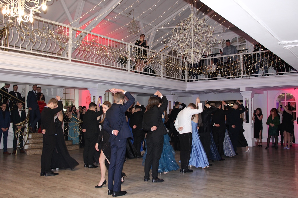 i Annę Pintal – kl. 5EE, którym podziękował za trud wychowawczy. W imieniu rodziców organizujących bal studniówkowy głos zabrała Pani Beata Kurek. Szczególnie miłym akcentem było wręczenie przez maturzystów kwiatów i przekazanie słów wdzięczności Panu Staroście, Panu Burmistrzowi, Dyrektorom Szkoły, nauczycielom, wychowawcom oraz rodzicom. Bal studniówkowy otworzył Pan Dyrektor, zapowiadając Poloneza, który przepięknie wykonali maturzyści pod czujnym okiem Pani Anny Wilk. Część oficjalna została uświetniona także przez wniesienie na salę pięknego tortu ze świecącymi fontannami. Uczniowie technikum zabrali także wszystkich w podróż sentymentalną w przeszłość ostatnich pięciu lat za pośrednictwem przygotowanej prezentacji. Zdjęcia i rodzące się przy tym wspomnienia pokazały, jak był to ważny okres w procesie wychowawczym i edukacyjnym młodzieży. Po części oficjalnej i smacznym obiedzie rozpoczęła się wspólna zabawa. Taneczna muzyka, smaczne potrawy i przekąski a przede wszystkim wspólna zabawa, rozmowy i czas mile spędzony w przyjemnym towarzystwie, pięknej sali na pewno będą długo wspominane przez maturzystów i zaproszonych gości. Szczególne podziękowania należą się organizatorom uroczystości – Rodzicom, którzy zadbali nie tylko o piękną salę, smaczne menu, ale przede wszystkim o sympatyczną atmosferę. Młodzieży należy podziękować za pierwszy zdany egzamin z kulturalnego i dojrzałego zachowania się na zabawie studniówkowej.