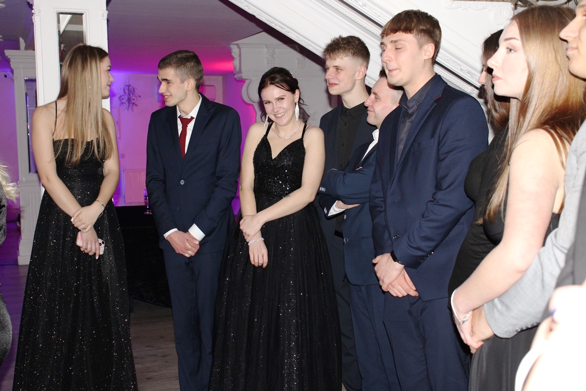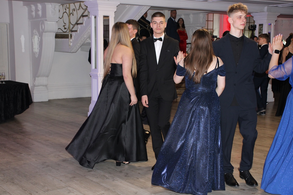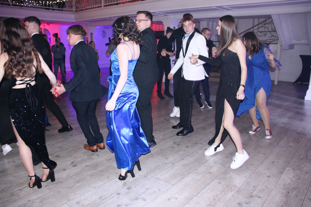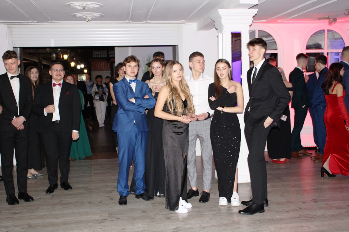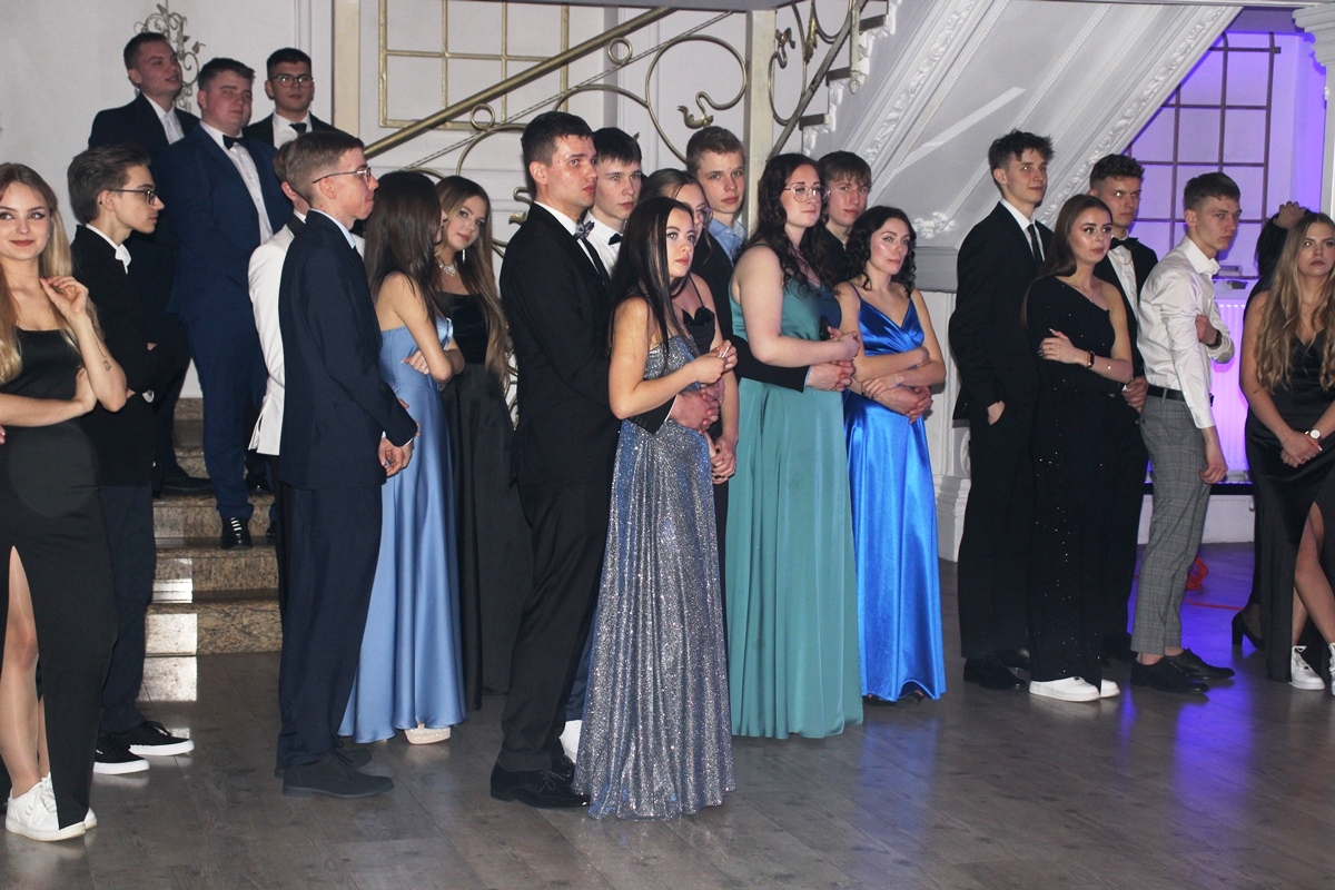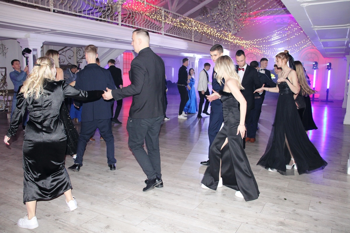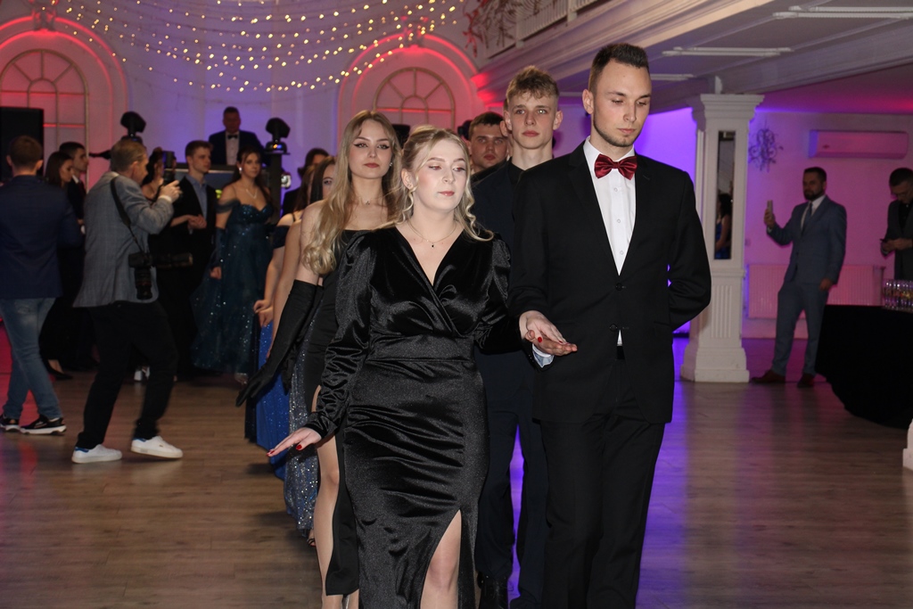 i Annę Pintal – kl. 5EE, którym podziękował za trud wychowawczy. W imieniu rodziców organizujących bal studniówkowy głos zabrała Pani Beata Kurek. Szczególnie miłym akcentem było wręczenie przez maturzystów kwiatów i przekazanie słów wdzięczności Panu Staroście, Panu Burmistrzowi, Dyrektorom Szkoły, nauczycielom, wychowawcom oraz rodzicom. Bal studniówkowy otworzył Pan Dyrektor, zapowiadając Poloneza, który przepięknie wykonali maturzyści pod czujnym okiem Pani Anny Wilk. Część oficjalna została uświetniona także przez wniesienie na salę pięknego tortu ze świecącymi fontannami. Uczniowie technikum zabrali także wszystkich w podróż sentymentalną w przeszłość ostatnich pięciu lat za pośrednictwem przygotowanej prezentacji. Zdjęcia i rodzące się przy tym wspomnienia pokazały, jak był to ważny okres w procesie wychowawczym i edukacyjnym młodzieży. Po części oficjalnej i smacznym obiedzie rozpoczęła się wspólna zabawa. Taneczna muzyka, smaczne potrawy i przekąski a przede wszystkim wspólna zabawa, rozmowy i czas mile spędzony w przyjemnym towarzystwie, pięknej sali na pewno będą długo wspominane przez maturzystów i zaproszonych gości. Szczególne podziękowania należą się organizatorom uroczystości – Rodzicom, którzy zadbali nie tylko o piękną salę, smaczne menu, ale przede wszystkim o sympatyczną atmosferę. Młodzieży należy podziękować za pierwszy zdany egzamin z kulturalnego i dojrzałego zachowania się na zabawie studniówkowej.